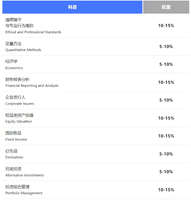 CFA二级考试包含CFA考试知识体系(CFA Program Candidate Body of Knowledge)中所涵盖的所有十个科目。科目与一级相同,但是科目的具体权重有所改变。