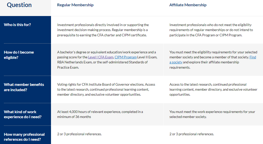 CFA会员分为两类:正式会员(Regular Membership)和附属会员(Affiliate Membership),两类会员的申请资格要求、福利不同: