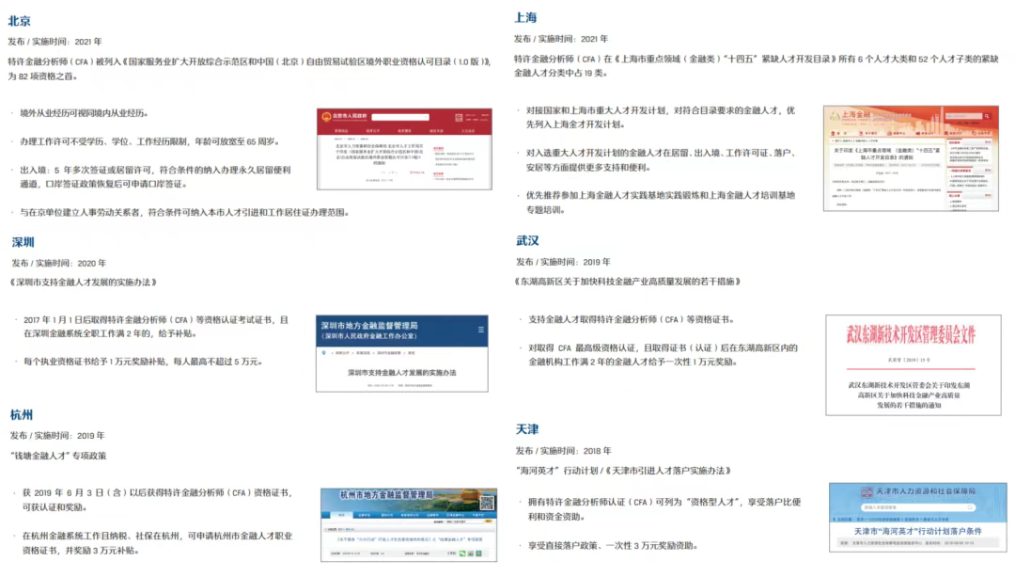 政府认可:在国内,随着金融市场的快速发展,CFA持证人日益受到重视。许多城市纷纷出台政策(包括北京、上海、广州、深圳、杭州、武汉、成都、天津、厦门、青岛、南京、西安、三亚、宁波、晋江、温州、佛山等20+城市),吸引CFA持证人在当地发展。