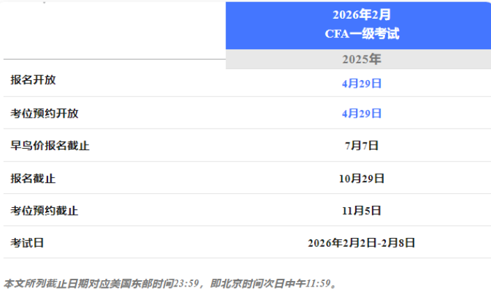 2026年2月CFA考试已开放报名,早鸟价阶段将于2025年7月7日23:59(北京时间7月8日中午11:59)截止。现在报名,立省350美元。