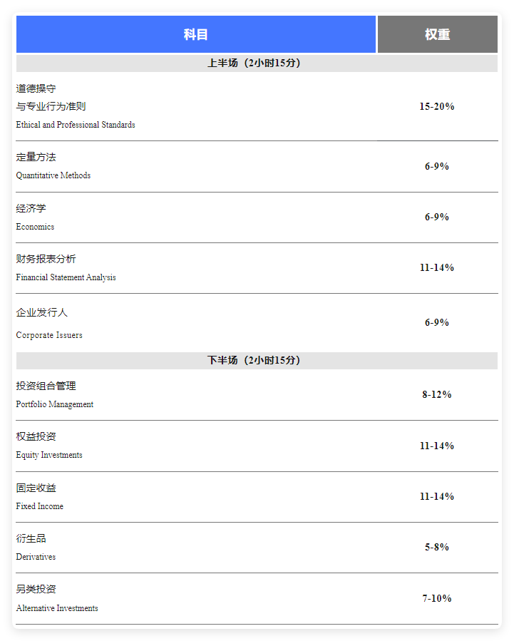 CFA一级考试包含道德操守与专业行为准则、定量方法、经济学、财务报表分析、企业发行人、权益投资、固定收益、衍生品、另类投资、投资组合管理十个科目。具体权重请见下表。