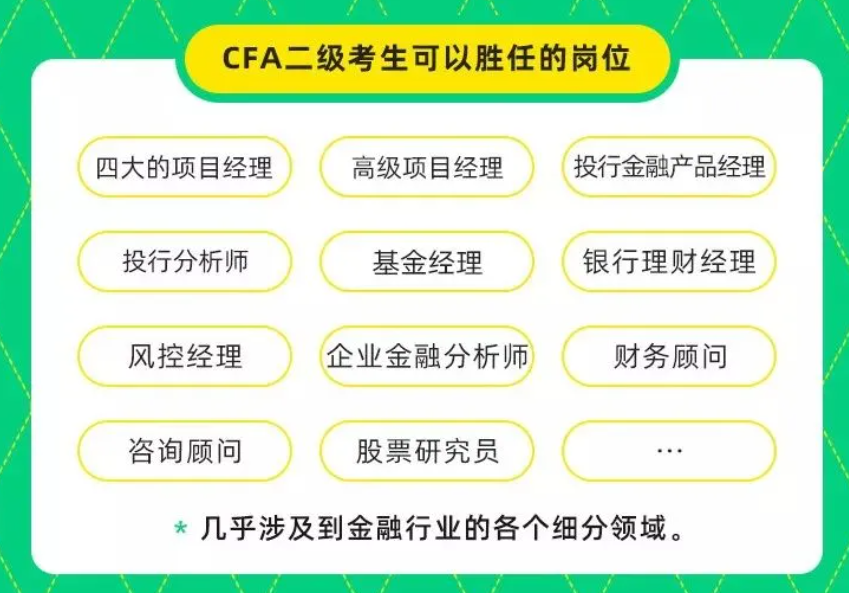 完成CFA二级考试,相当于完成了专业的深化之路。可胜任岗位包括投行分析师、基金经理、银行理财经理、风控经理、四大项目经理等。二级学习的价值点在于完备的金融专业训练,几乎覆盖金融各细分领域。