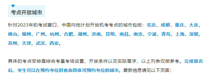 针对2025年的考试窗口,中国内地计划开放的机考考点所在城市包括:北京、长沙、成都、重庆、大连、佛山、福州、广州、贵阳、海口、杭州、哈尔滨、合肥、湖州、济南、昆明、兰州、南昌、南京、南宁、宁波、青岛、上海、深圳、石家庄、苏州、太原、天津、武汉、无锡、厦门、西安、郑州、珠海。