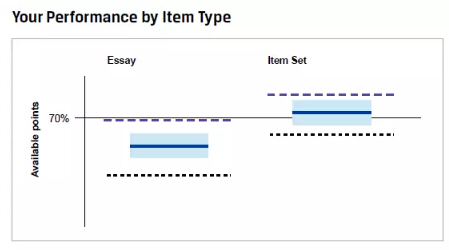 分题型表现的成绩单是只有CFA L3的考生才能收到,因为L3题型与L2和L1不同——上午为写作题、下午为客观题。如下图,图中所涉及的各种线的含义与“不同科目表现”、“总体科目表现”是相同的。