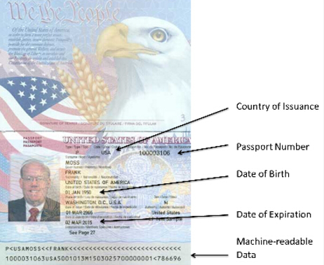 Contains your name,* date of birth, passport number, expiration date, and the name of the country that issued the passport;
