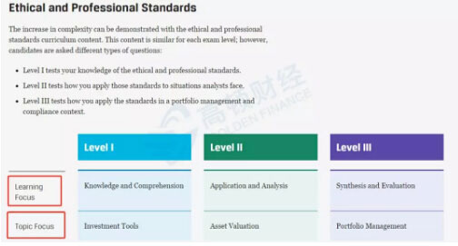 关于CFA各级考试的不同,CFA协会认为可以通过道德和专业标准课程内容来证明复杂性的增加。