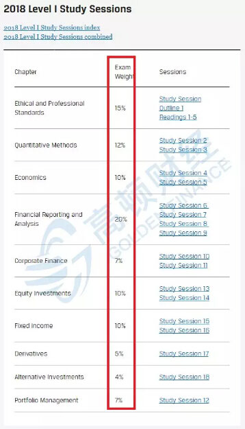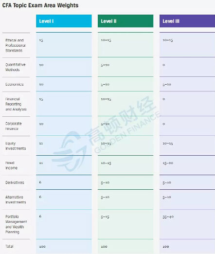 CFA考试共有十个科目,由于每个级别的考试考察的主题不同,因此在各科目的侧重上也给予了不同的分值权重。