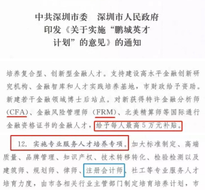 其实在8月份,深圳人民政府就印发《关于实施“鹏城英才”的意见》的通知,目的正在引进人才,对各类财会人才、金融人才进行奖励,补贴,甚至直接发钱,最高可领取5万元的补贴。