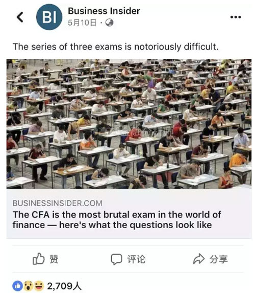 不过,我一直以为这是中国人才会头疼的问题,直到前几天,我看到了知名权威媒体Business Insider(以下简称BI )在Facebook上发表的一篇文章,我才知道,在外国人眼里,CFA也是一个变态般的存在。