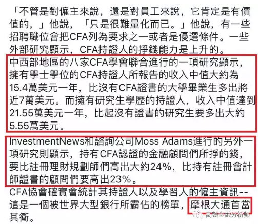 一家与BI存在竞争关系的知名期刊《Bloomberg Businessweek》就发表过相关文章(中文版),肯定了CFA的价值。文章中引用了数个调查结果,表明了成为CFA持证人的种种优势。