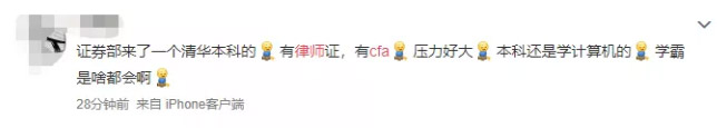 “证券部来了一个清华本科的,有律师证,有CFA,压力好大,本科还是学计算机的,学霸是啥都会啊”。
