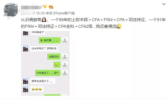 两位券商人士,在年轻+高学历后,拖着一长串的证书标签,CFA、FRM、CPA、司法......让同龄人表示看完后深受伤害,无地自容。
