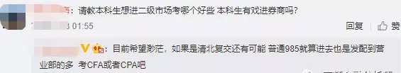 此外,也有虚心求教者,求问:本科生想进券商二级市场有没有戏?博主表示:如果是顶尖名校有可能,如若不然,还是建议考CFA或者CPA!