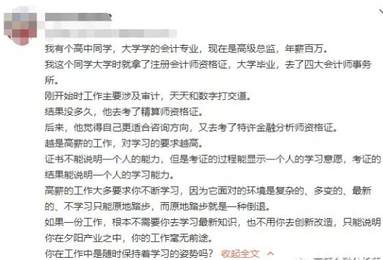大学考了CPA(注:多年前CPA大学时期是可以全部考出拿到证的),进了四大,之后又分别考了精算师和CFA,如今已是高级总监,年薪百万。