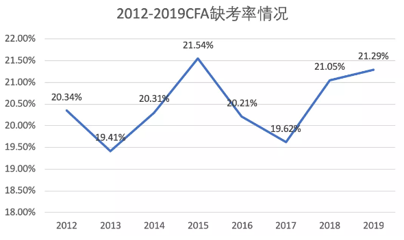 中国cfa®考试网制作了关于2012年到2019年的缺考率趋势图:(平均每年20%左右的缺考率)