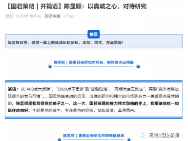 连国泰君安研究所所长黄燕铭都如是说:“陈显顺是我最得意的弟子之一。这一次,国君策略的接力棒交到他的手上,我相信他能一如既往地做好。年轻是他的资本,专注是他的标签。恰如后浪,奔涌而来。”