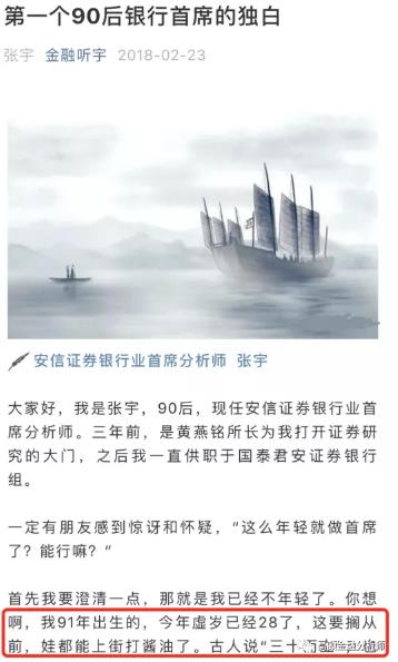据了解,张宇出生于1991年,2015年至2017年供职于国泰君安研究所银行组,由邱冠华(中国首位银行新财富白金分析师)领导;2018年初任安信证券银行业首席分析师,彼时才27岁。