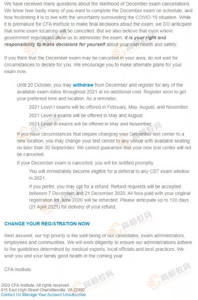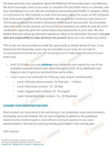 往年修改考点的截止时间较晚,临近考试前几天都可以。但今年不一样啦,CFA协会在官网更新了2020年12月考点修改截止时间,务必在9月30日前完成。