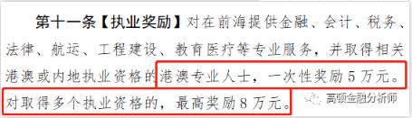 对在前海提供金融、会计、税务等专业服务,并取得相关港澳或内地执业资格的港澳专业人士,一次性奖励5万元。对取得多个执业资格的,最高奖励8万元。
