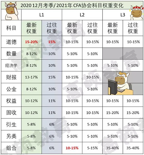 关于近日协会更新的2021年CFA一二三级考试题型变化、权重标准,很多考生还不清楚2021年CFA考试科目有哪几门?占比分别是多少?