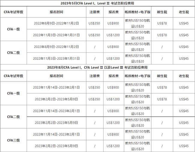 注册费(Enrollment Fee):只需初次注册CFA考试时缴纳,即意味着在报考二级、三级考试时无需再缴。