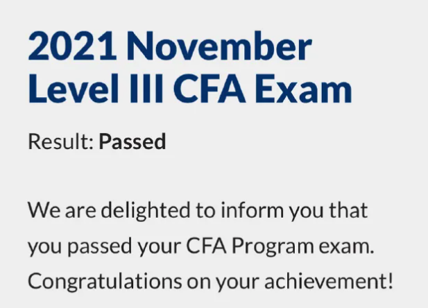 已经有考生陆续收到CFA三级成绩邮件,至此2021年11月CFA考试三个级别的全球通过率正式揭晓!