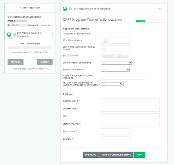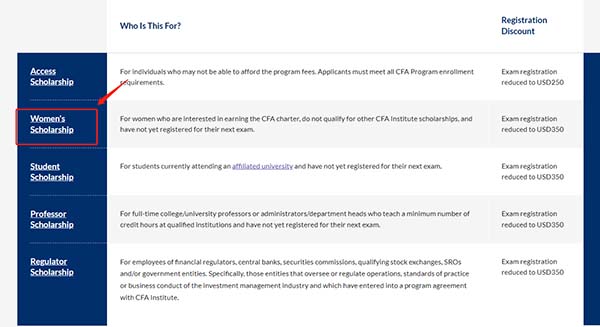 对于有兴趣获得CFA执照的女性,没有资格获得其他CFA学院奖学金,并且尚未注册参加下一次考试。当然,申请名额可能有限制,越早申请,CFA协会受理的就越快,申请的成功率就越高!