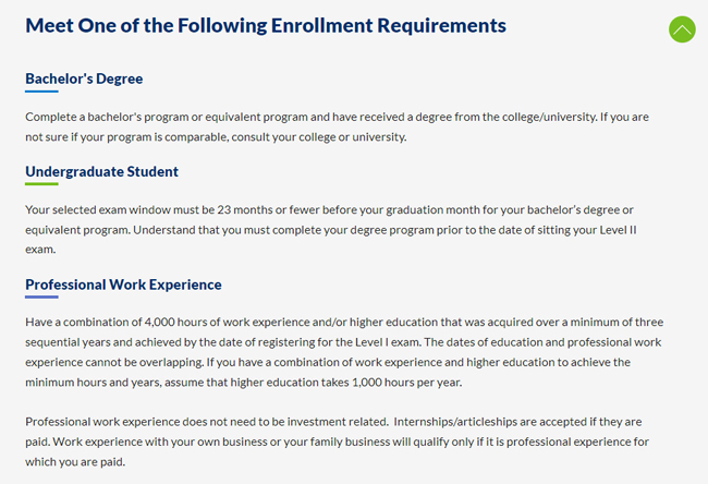 在报名CFA一级考试时,必须连续三年获得至少4,000小时的工作经验和/或高等教育。相关教育经历和工作经历在时间上没有重叠。如果结合工作经验和高等教育来达到最低小时数和年数,则假定高等教育每年需要1,000小时。