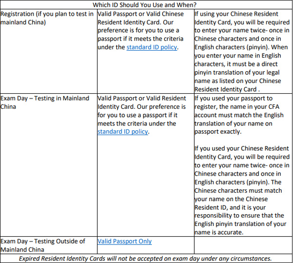 正式进入CFA考场前,考生需要接受工作人员的身份核验,此环节中,考生需要出示本人的居民身份证或者是国际旅行护照证明考生身份,具体出示何种证件可以参考: