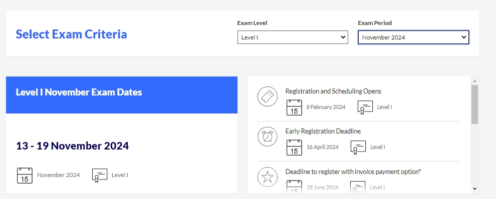 2024年11月CFA一级考试时间:2024年11月13日-2024年11月19日