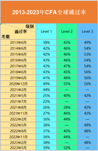CFA协会对近十年CFA各级别考试的通过率进行了调查,调查的结果显示: