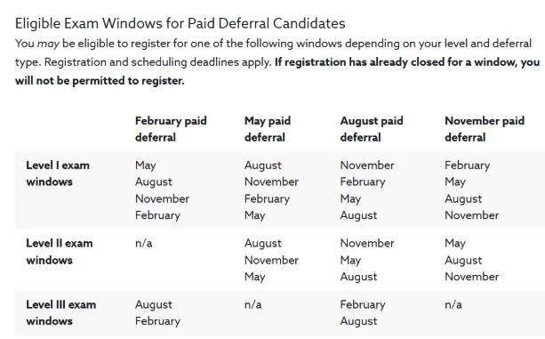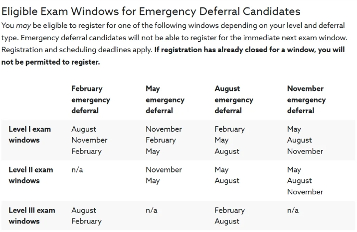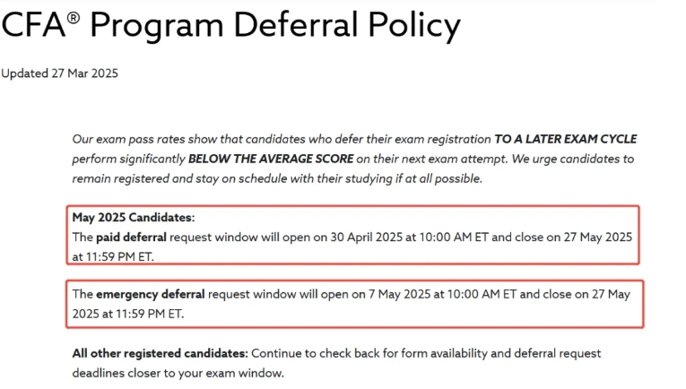 5月CFA延期政策已公布!对于已预约25年5月考期,但是无法按照计划参加考试的考生,可以在以下时间内申请延期: