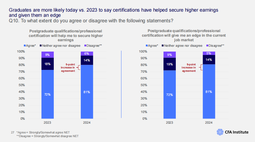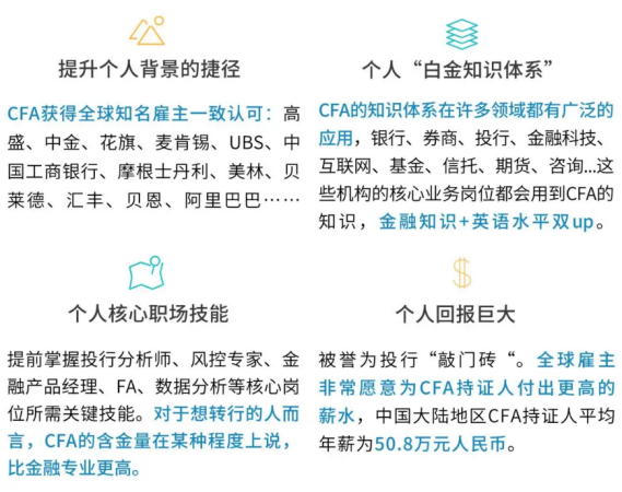 ●如果你对于自己的求职规划是进入投行工作,像IBD、Wealth Management等大多数的岗位对于CFA都是没有明确要求的。虽然没有明确的要求,但是悄悄告诉你:考过一级CFA对这类的岗位来说是个加分项哦!●但是像资管、对冲基金等买方公司,需要进行投资组合管理和资产估价,对Technical Skills的要求更高,在求职时可能会要求持求职者有CFA证书。CFA持证人认为通过CFA考试,帮助自己获得了更高的收入