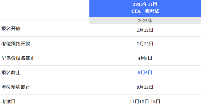 2025年11月CFA(特许金融分析师)考试标准价报名将于2025年8月5日23:59(北京时间8月6日中午11:59)截止。
