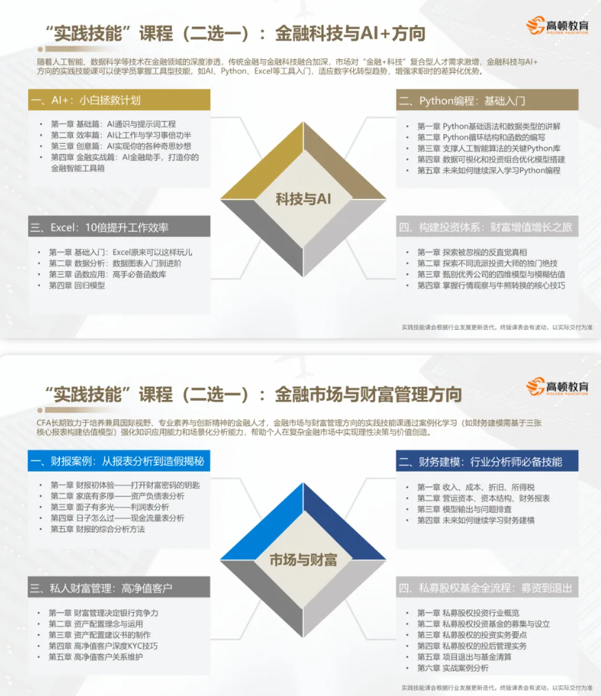 除了常规CFA网课外,还设置了两类实践课程:一类侧重金融市场与财富管理的实际操作,另一类聚焦金融科技与AI在金融领域的应用。(更多资料和试听课请添加 cnseo1 )